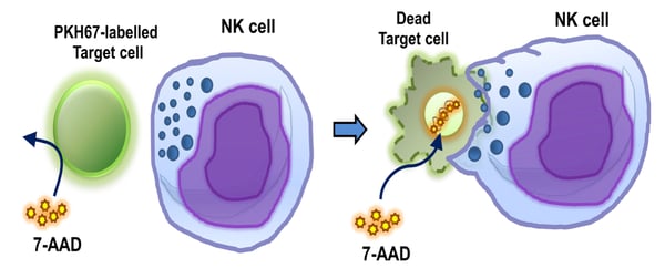 NK cytotoxicity assay: We have developed and offer a flow cytometry based NK cytotoxicity assay to evaluate human and non-human primate NK cell effector function. K562 target cells are labeled with PKH67 (a fluorescent green dye that labels the cell membrane) to discriminate target cells from effector cells. Then, effector cells (PBMCs) are incubated with the PKH67 labeled K562 target cells at different Effector to Target (E:T) cell ratios from 100:1, 50:1 and 25:1. After co-culture, the cell mixtures are stained with 7-AAD (7-Aminoactinomycin D) which is a fluorescent chemical compound with a strong affinity for DNA used to detect dead cells (Figure 1).