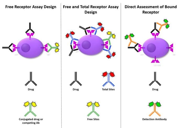 - Free Receptor Assay: Shown in the Left Panel is an illustration of free receptors that are not occupied by biotherapeutic agent detected using either a fluorescently labeled competitive antibody or biotherapeutic agent.